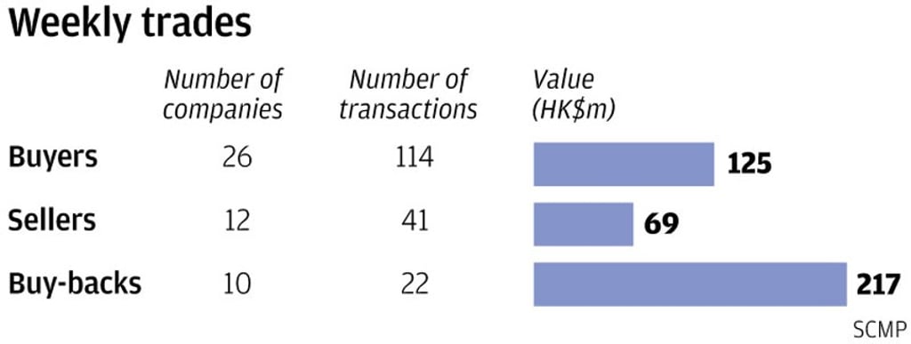 More companies bought back their own shares in the March 16 to March 22 period, with 10 companies posting 22 repurchases worth HK$217 million, up from the previous five days’ seven companies buying back HK$152 million. The number of trades, however, was down from the previous period’s 26 repurchases.