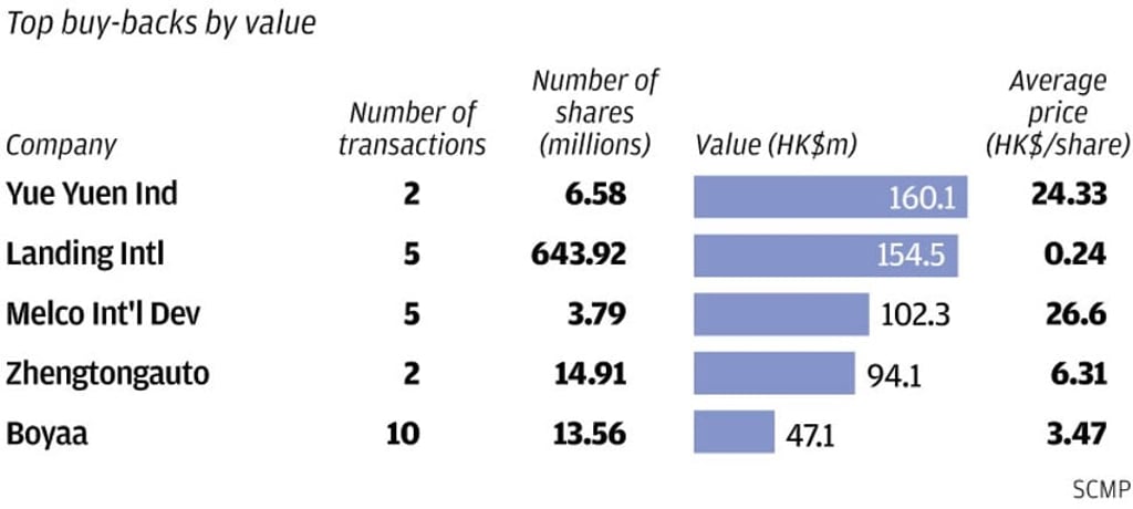 Footwear manufacturer Yue Yuen Industrial recorded its first buy-back since December 2017 with 6.58 million shares purchased on April 13 at HK$24.33 each. The trade was made on the back of the 36 per cent drop in the share price since January 22. The group previously acquired 427,000 shares from November 30 to December 1, 2017 at an average of HK$27.79 each. The stock closed at HK$22.35 on Friday.