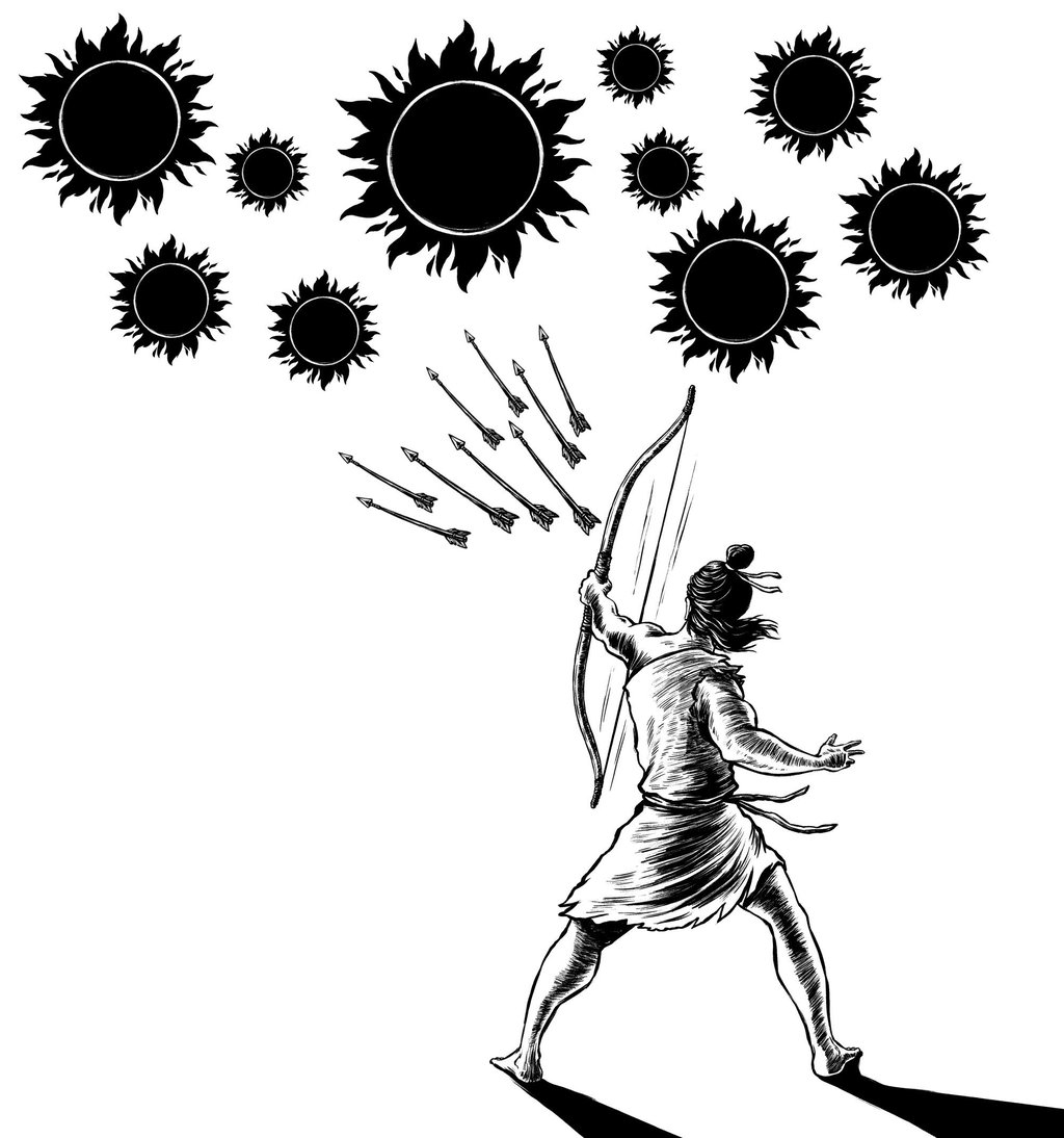 Many moons ago, there were 10 suns in the sky and they took turns travelling across the sky. One day, they decided to rebel and they all came out at once.