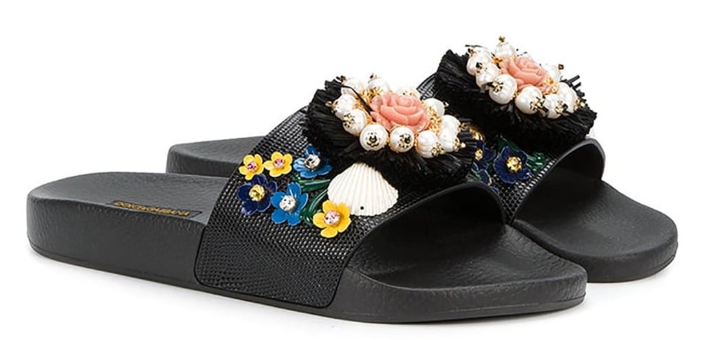 Catch some rays in Linda Farrow shades, Dolce & Gabbana slides and an adorable off-the-shoulder bikini by Lisa Marie Fernandez