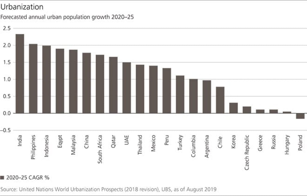Cities in China and India are forecast by the UN to receive 181m and 113m urban migrants, respectively, from 2015 to 2025. Asia is currently home to 22 of the 33 global megacities (cities above 10m) and will add nine more by 2030. Rapid urbanization and income growth depletes key resources, absorbs agricultural land and expands carbon footprints.